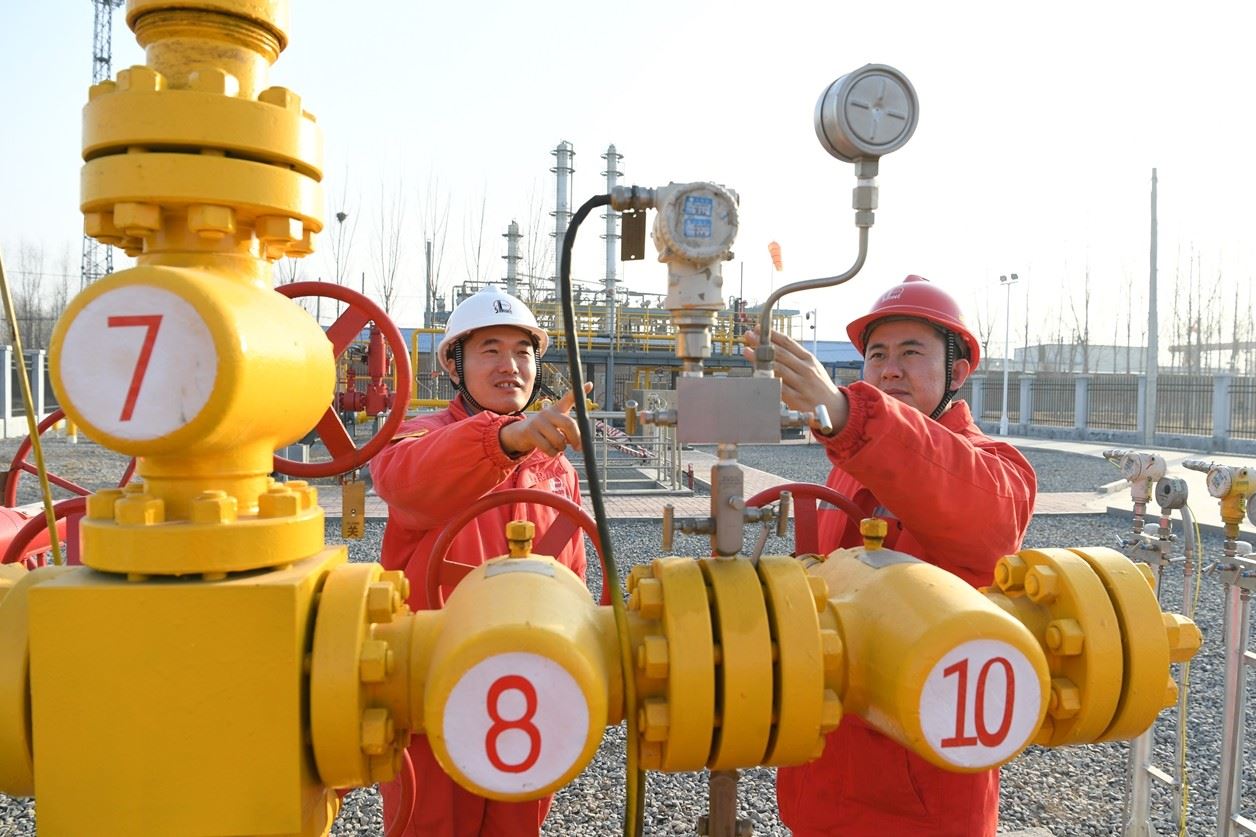 春节期间,储气库管理中心卫11储气库进行应急注气,岗位员工加密设备巡检频次,实时监控生产参数,科学调控注气节奏,保障了安全平稳注气。截至2月23日,该库应急注气3800万立方米。图为2月18日,该库员工在2号丛式井场检查井口压力。